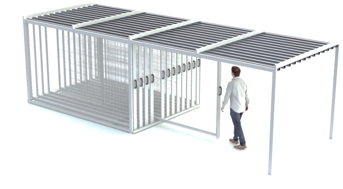 Configuração com estrutura autoportante com área de circulação frontal para abertura do painéis telados