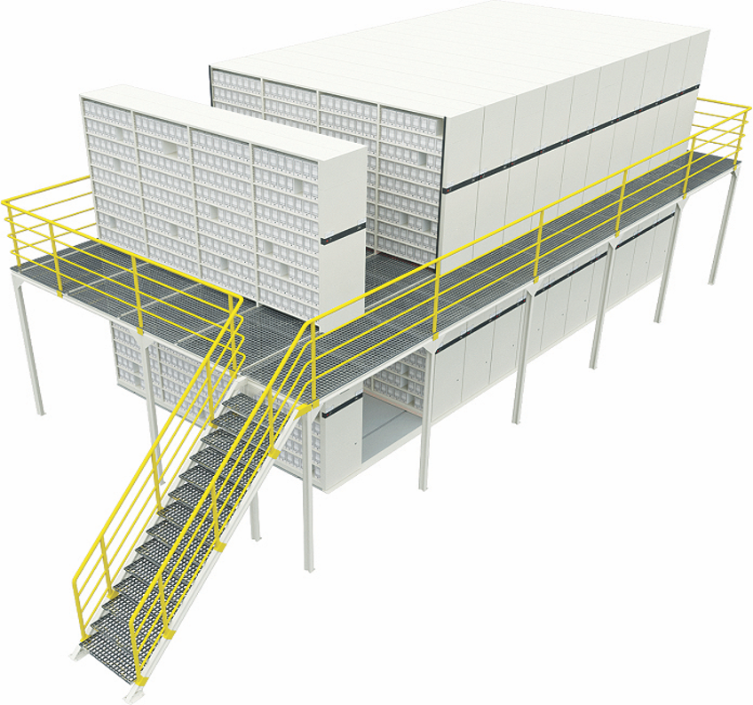 Para ampliar ao máximo a ocupação do espaço em locais de instalação de elevado pé direito, os sistema de 2 pavimentos podem até quintuplicar a capacidade em volume arquivado