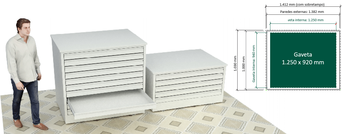 - Gavetas com formato especial para plantas e documentos iconográficos de formato A0 ou superior.