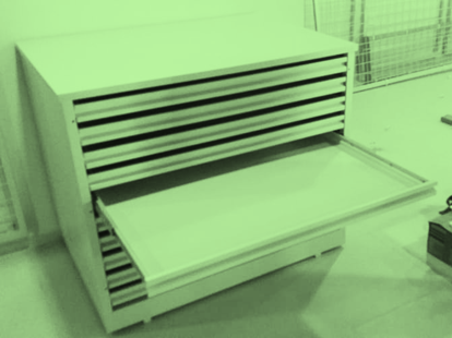 Mapotecas especiais para plantas-baixas e documentos iconográficos de formato até A0, ou superior. Dotadas de trilhos telescópicos de alta resistência e dispositivo de autotravamento.