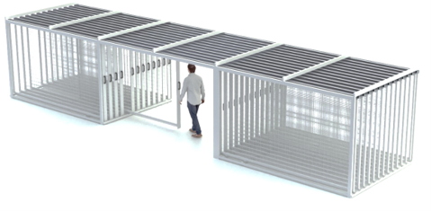 Configuração com estrutura autoportante com área de circulação frontal para abertura do painéis telados